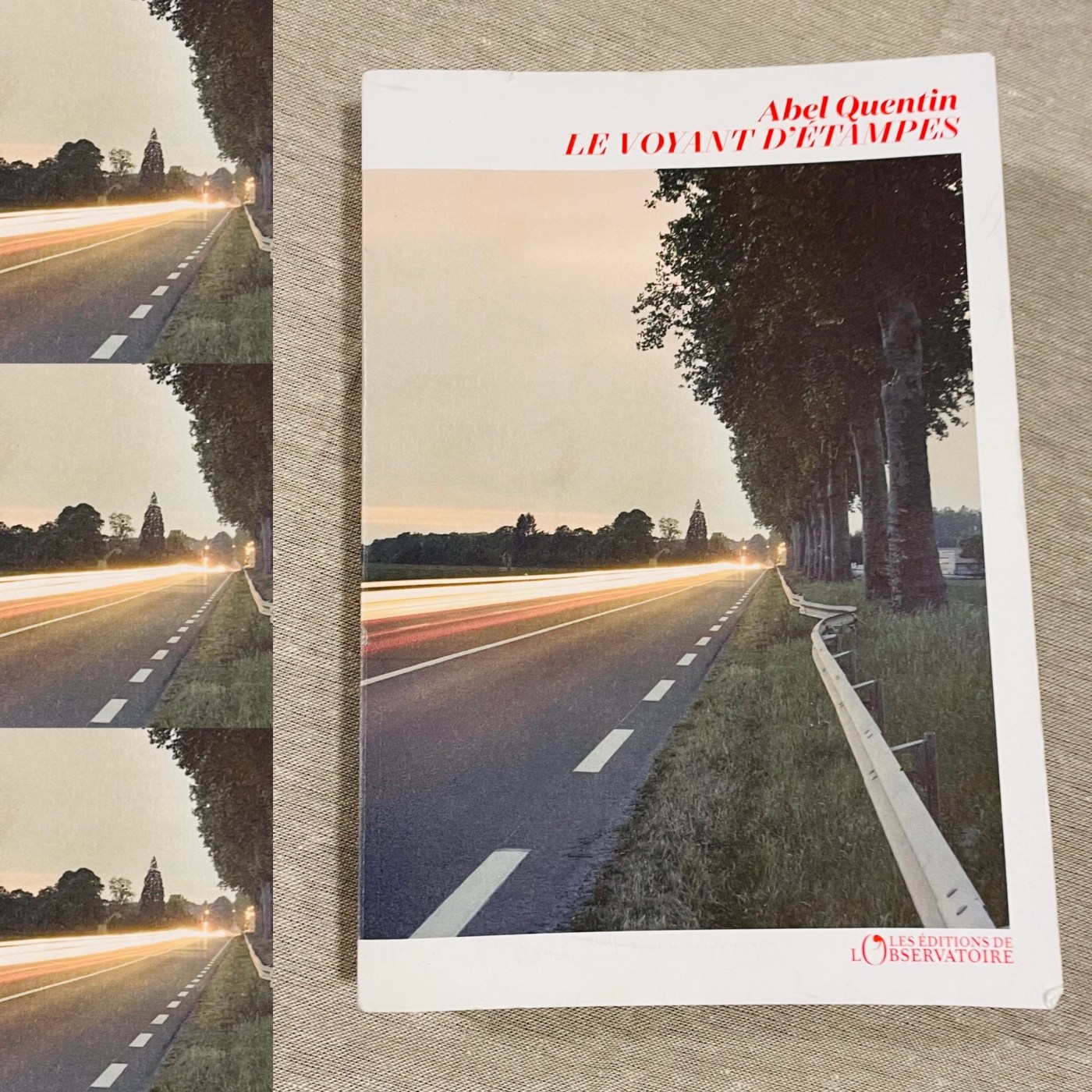 Ça n’a pas loupé ! Je vois une photo en plan serré d’une route nationale à la tombée de la nuit. On dirait une route beauceronne, le genre de route bien utilitaire pour traverser des champs de betteraves. On n’est pas sur du bucolique, du champêtre, on est sur du « appuie sur le champignon, qu’on se magne d’arriver ». La couverture est mate. Ben oui, tu penses, le brillant ça risquerait de faire plus joli. Manquerait plus qu’on attire le client. Et pourtant, j’avoue qu’elle envoie, cette photo, elle est même hypnotique.